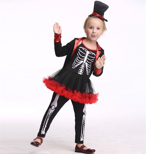 Fantasia Infantil Menina Esqueletina com Chapéu Vermelho e Preto