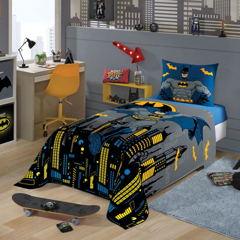 - 01 Sobrelençol com estampa do Batman em Gotham City. Tam.: 1,50x2,10m.